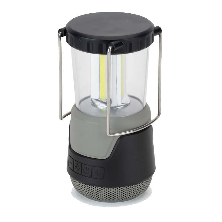 Rechargeable 3-in-1 lantern with built-in wireless speaker. Features COB light; 120 lumens; folding metal handles; control panel on the body; charge time: 5 hours; speaker output: 5W; playtime: approx. 12 hours (with lantern light off); USB charging cable included.