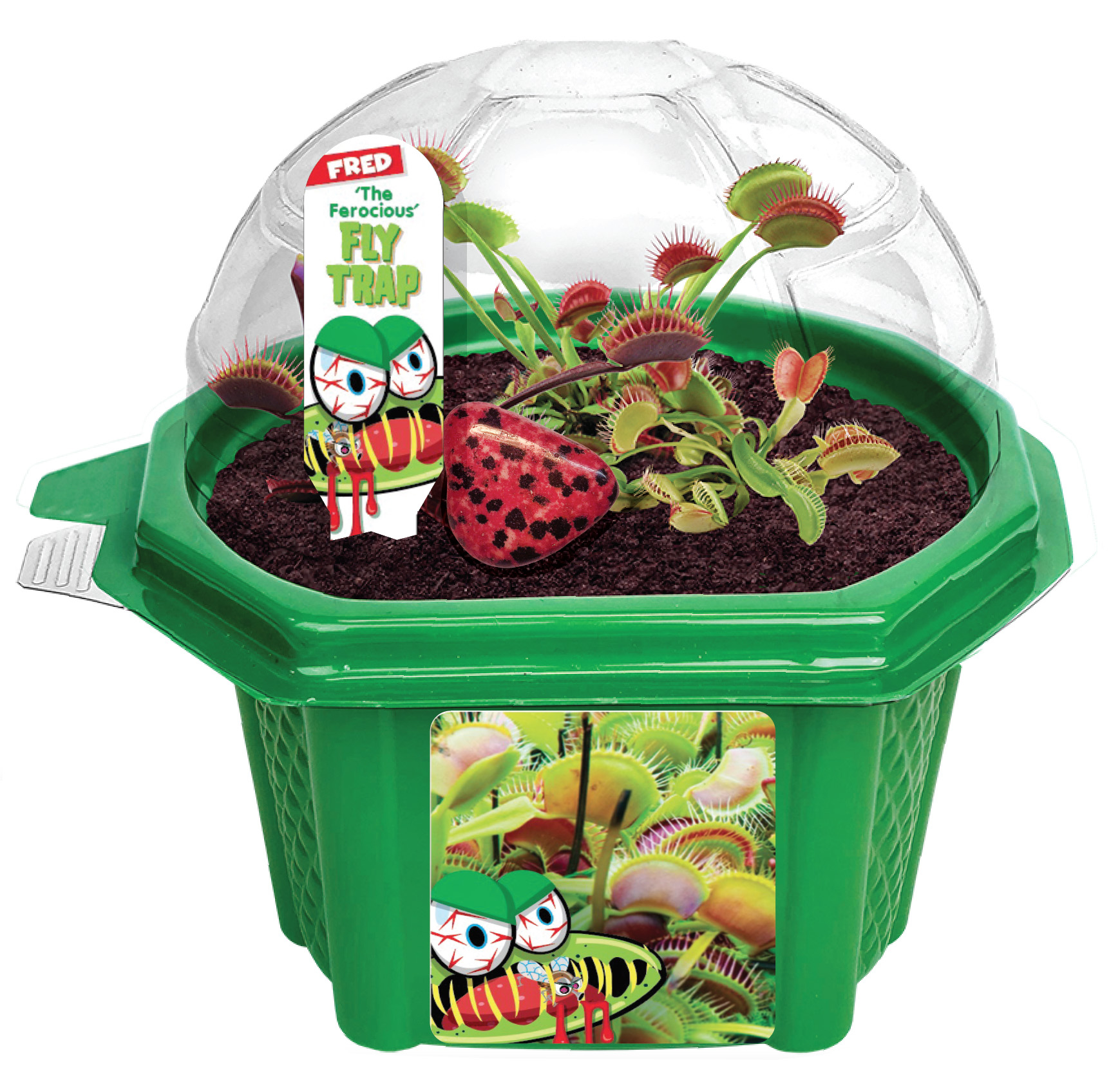 Fred the Ferocious Fly Trap really eats bugs! Although they take some time to sprout, they are fascinating to grow. These plants originated from a small region in North Carolina and are extremely specialized plants. This entertaining kit comes with everything you need, even a collectible plant stake and genuine red jasper stone- just add water! You can ONLY USE DISTILLED WATER as the plants cannot tolerate the minerals and salts in tap or spring water. The red jasper stone represents the meat that these plants eat!