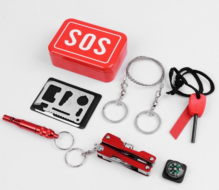 This Survival Kit is compact to fit in your Back Pack when camping or hiking. Contains: Instruction Manual, Wire Saw, Multifunction Flashlight Pliers (with battery), Magnesium flint fire starter, Stainless Steel Versatile Tool Card, Emergency Whistle, & a Compass. All this fits in a handy metal tin (4.6"x3.3"x1.5").
